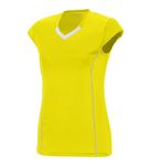 100% polyester wicking smooth knit * Wicks Moisture * Odor resistant * Ladies' fit * Tag-free label * V-neck collar * Contrast color collar and princess seams * Set-in cap sleeves